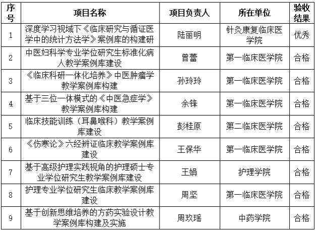 根据《关于开展2024年度专业学位研究生教学案例库建设培育项目结题验收的通知》要求,经各项目负责人申请、二级学院审核,研究生院组织复核验收,现将项目验收情况公示如下: